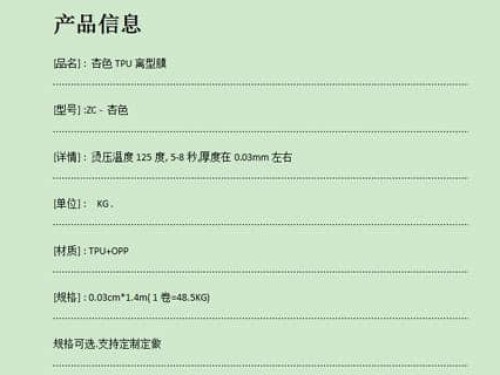 新款熱銷TPU離型膜,復(fù)合布料 免熱熔膠 免膠水 可直接復(fù)合為復(fù)合過程中省了很多環(huán)節(jié)型號:ZC-杏色品名:杏色-TPU離型膜規(guī)格:0.03mm*1.4m(可定制)耐溫:125度
